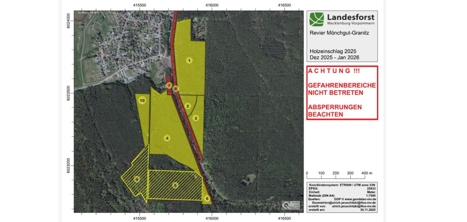 Державне лісове господарство інформує про лісозаготівельні роботи, що проводяться в районі Баабер-Хайде. Просимо не заходити в небезпечну зону та дотримуватися огороджень.Точну територію можна знайти на карті нижче.